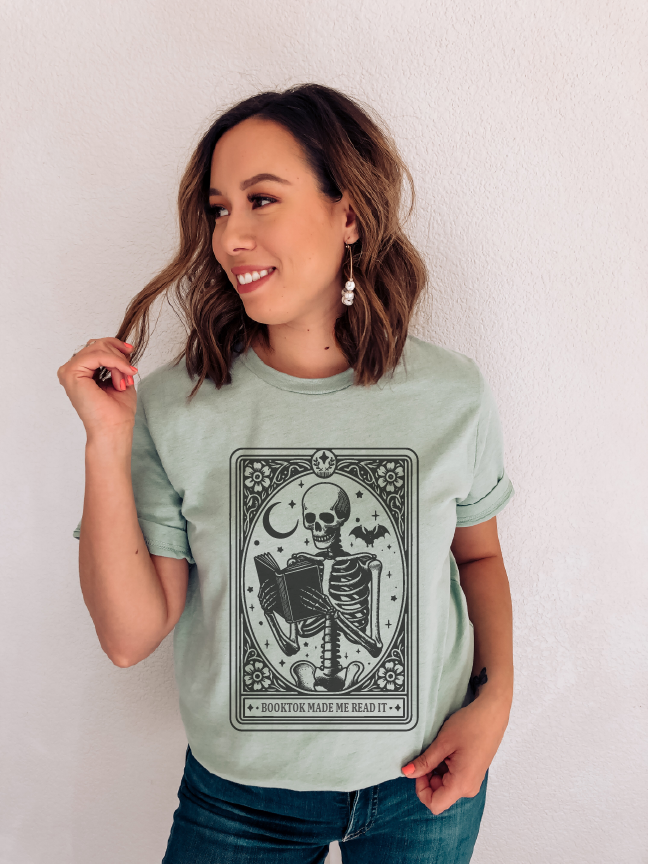 The Booktok Made Me Read It Bella Canvas Tee is a must-have addition to your wardrobe. This women's top features a unique skeleton tarot card design that is sure to turn heads. It's available in three beautiful colors, sage, mustard or blue, so you can choose the perfect one to suit your style.